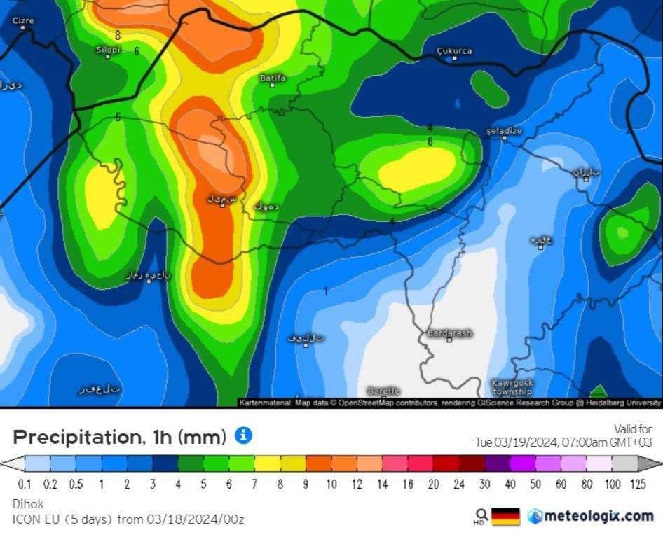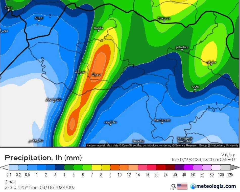 ھەرسێ مودێلێن ( ئەمریکی ، ئەوروپی ، ئەلمانی ) پێشبینیا بارینا بارانەکا بەلێزمە لسەر دەڤەرێن پارێزگەھا دھوکێ دکەن ژ ئەڤ شەڤە تا دەمژمێرێن نیڤرو سوباھی سێ شەمبی، بارینا برێکێ زوری باران ل ماوەیەکێ کێمدا ھندەک دەما دێ بیتە ئەگەرێ بلندبوونا ئاستێ ئاڤێ و چێبوونا لەھیا ل دەڤەرێن جودا ھەروەسا ئەگەرێ خشاندنا کەڤر و ئاخێ ھەیە لسەر رێکێن دەڤەرێن چیایێ.