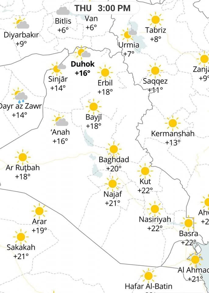 رێڤەبەریا سەقاناسی و بیڤەلەرزانیا پارێزگەھا دھۆکێ رەوشا سەقای یا پێشبینیکری بۆ ئەڤرۆ رۆژا پێنجشەمبی ١٢/٢٦ ڕاگەھاند، بڤی ڕەنگی یە: ▪️ سەقا؛ ل دەمێ سپێدێ ساھی و جێگیر بیت پاشی بۆ نیڤ عەوران ھێتە گوھۆ